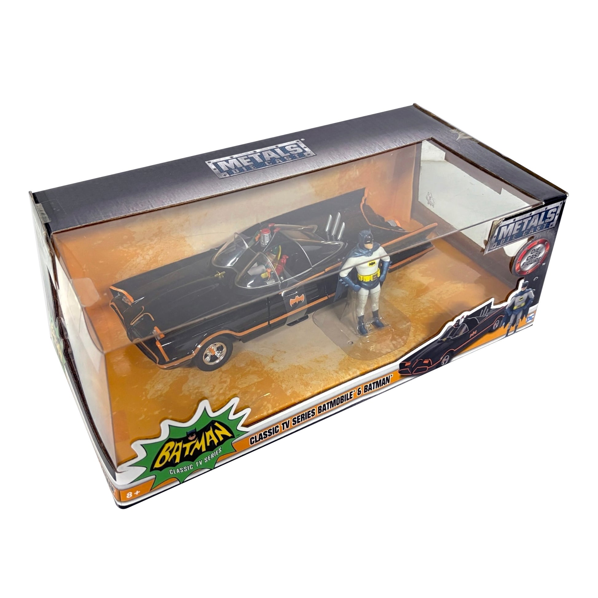 To the Batmobile! Let's go!" In October of 1965, the Batmobile was born, and the sleek and classic ride of the Caped Crusader features an enduring design that stands the test of time over 50 years later. The Batman 1966 TV Series Batmobile 1:24 Scale Vehicle with Figures from Jada Toys captures the Dynamic Duo in all their glory. The Batmobile comes with a 2 3/4-inch tall removable Batman figure, while the Robin figure is static in the Batmobile. The Batmobile features rubber tires. The vehicle and figures are packaged in a displayable window box.
