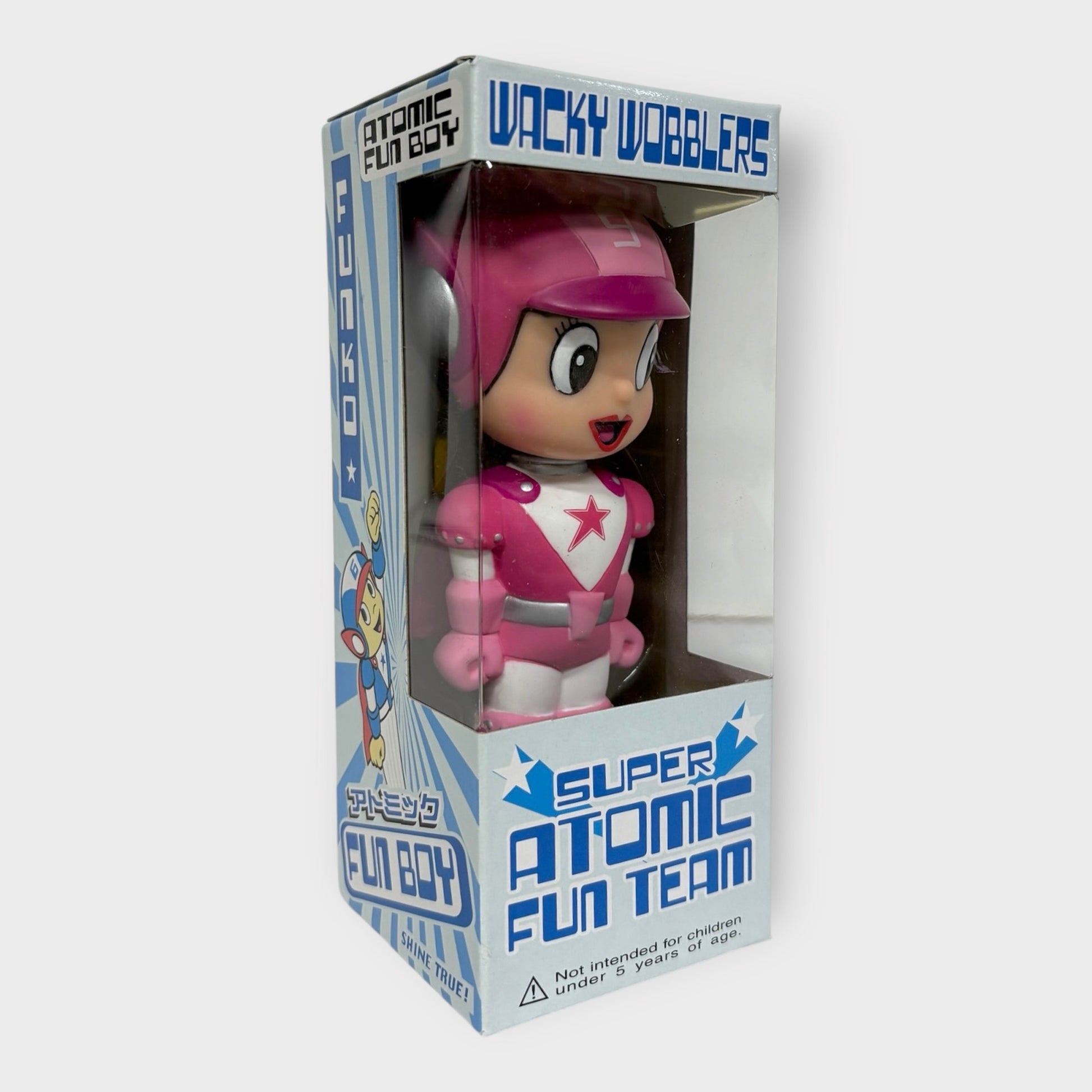 Atomic Fun Boy and Fun Girl are retired Wacky Wobblers, each individually packaged. Made of painted plastic, these figures feature oversized heads that wobble when shaken or bumped, thanks to a spring in the neck. Each Wacky Wobbler stands approximately 7 inches tall.