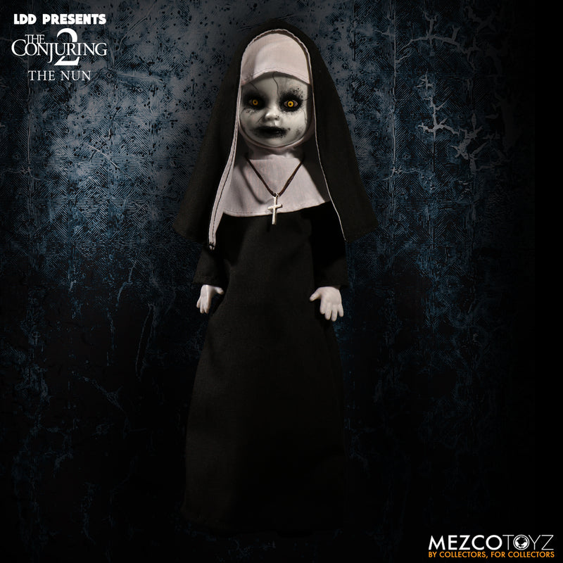 Now, The Nun joins the world of The Living Dead Dolls with a doll so frightening even Valak would want to keep the lights on. Standing a full ten inches tall, the doll is dressed in her trademark nun’s habit with necklace and has five points of articulation.