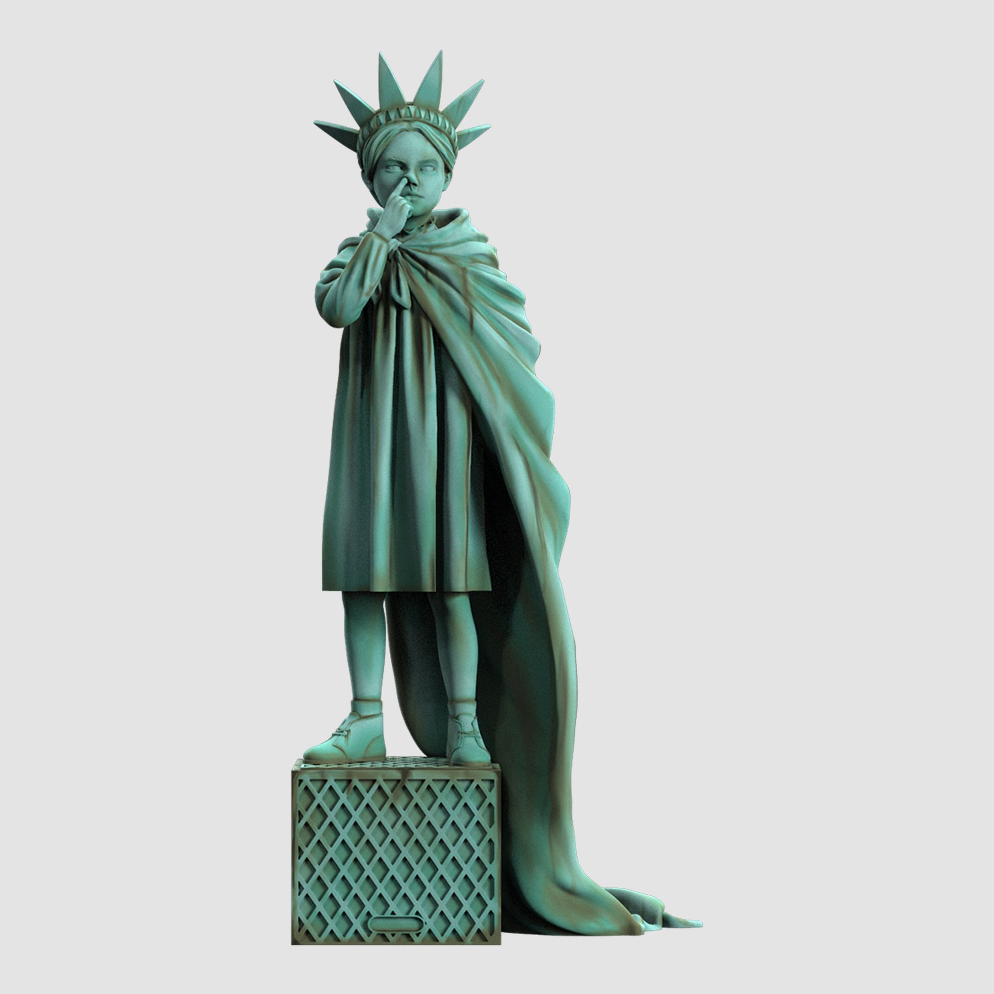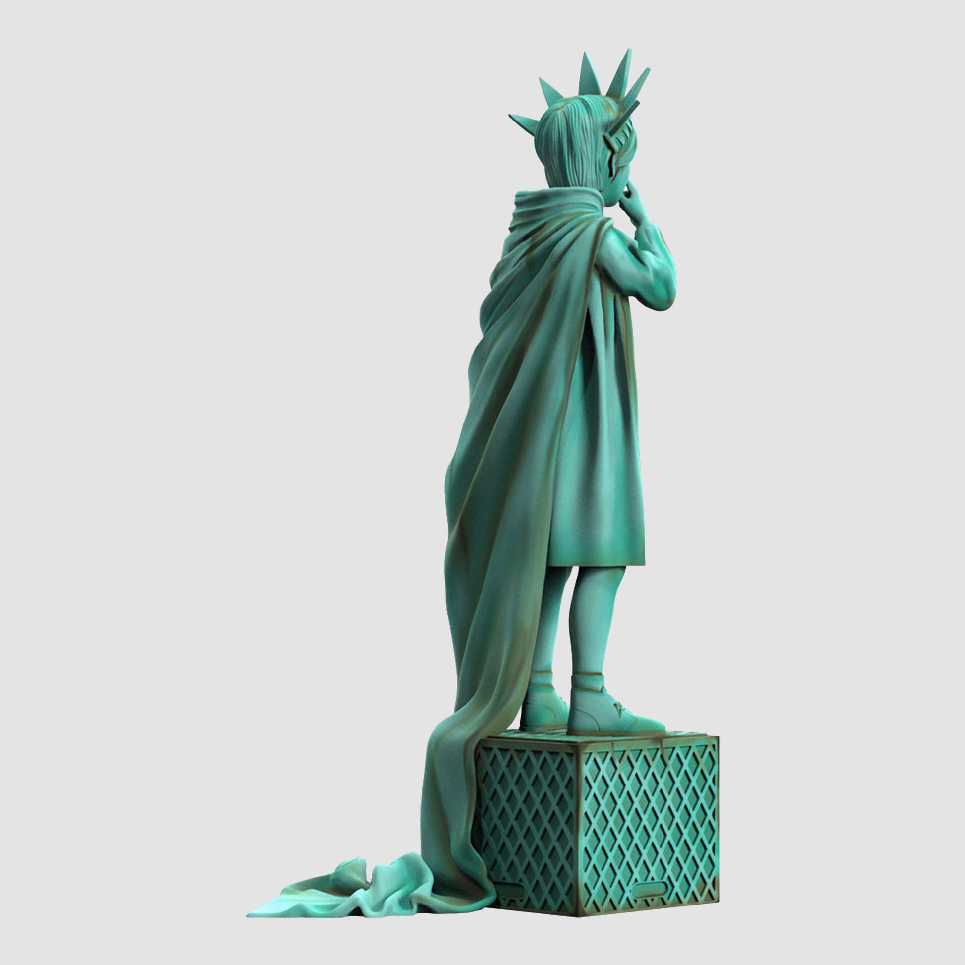 Donning an iconic green do, the second colorway of the popular Liberty Girl wears its inspirations on it sleeves. Standing on a box and picking her nose, Liberty Girl displays a childish arrogance in her play for liberty. Don't miss your chance to own this remarkable piece of art that is now immortalized as a special edition Polystone figure.