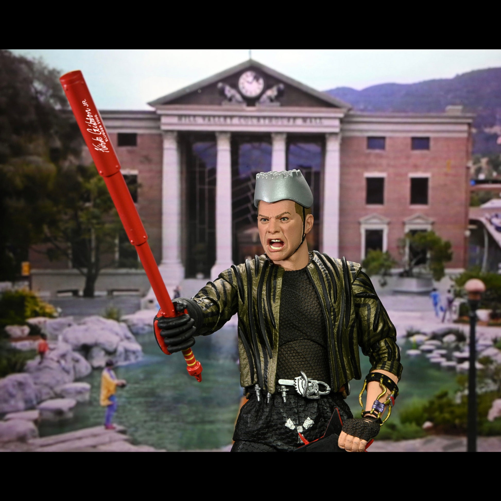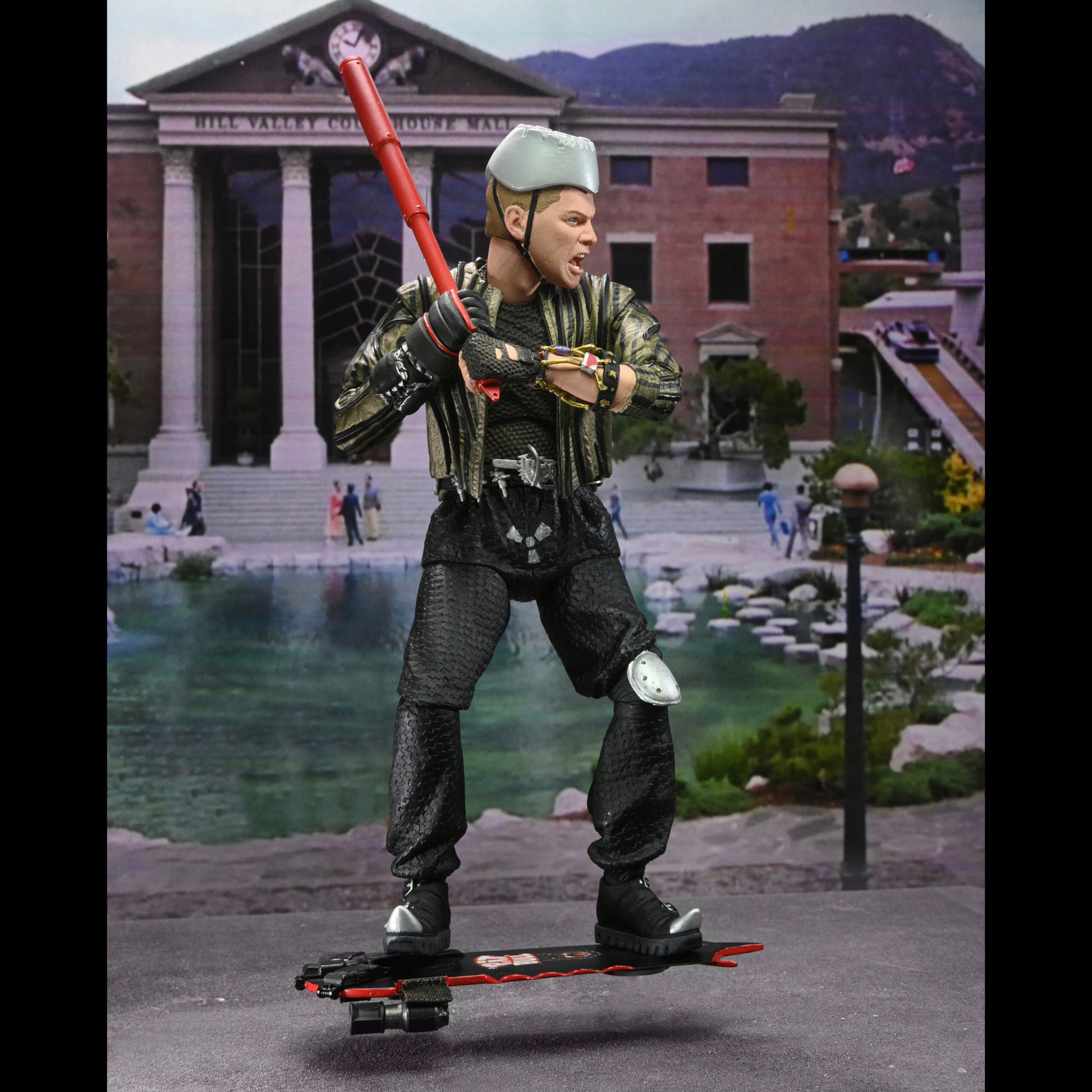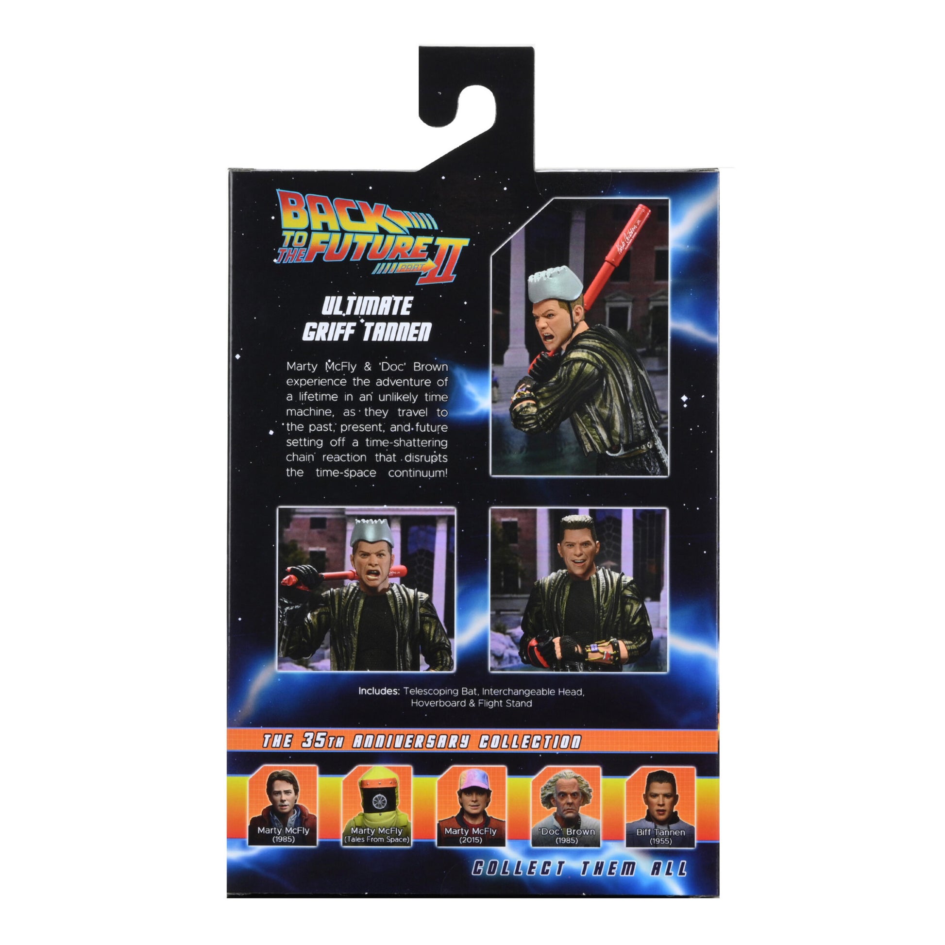 In Back to the Future Part 2, Marty and Doc experience the adventure of a lifetime in an unlikely time machine as they travel to the past, present, and future, setting off a time-shattering chain reaction that disrupts the space-time continuum! Standing approximately 7” tall, this Ultimate Griff Tannen figure is a menace! Includes telescoping bat, interchangeable head, hoverboard, and flight stand accessories.