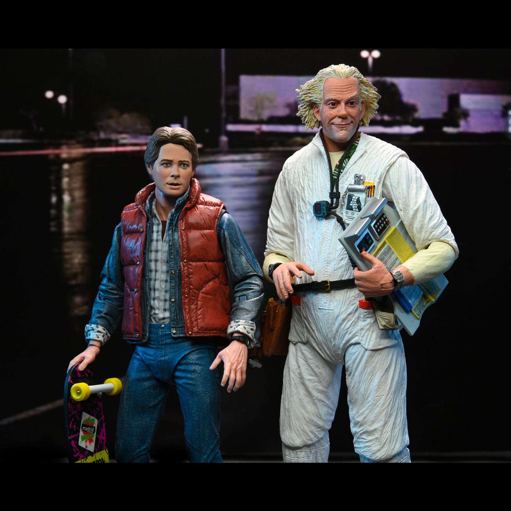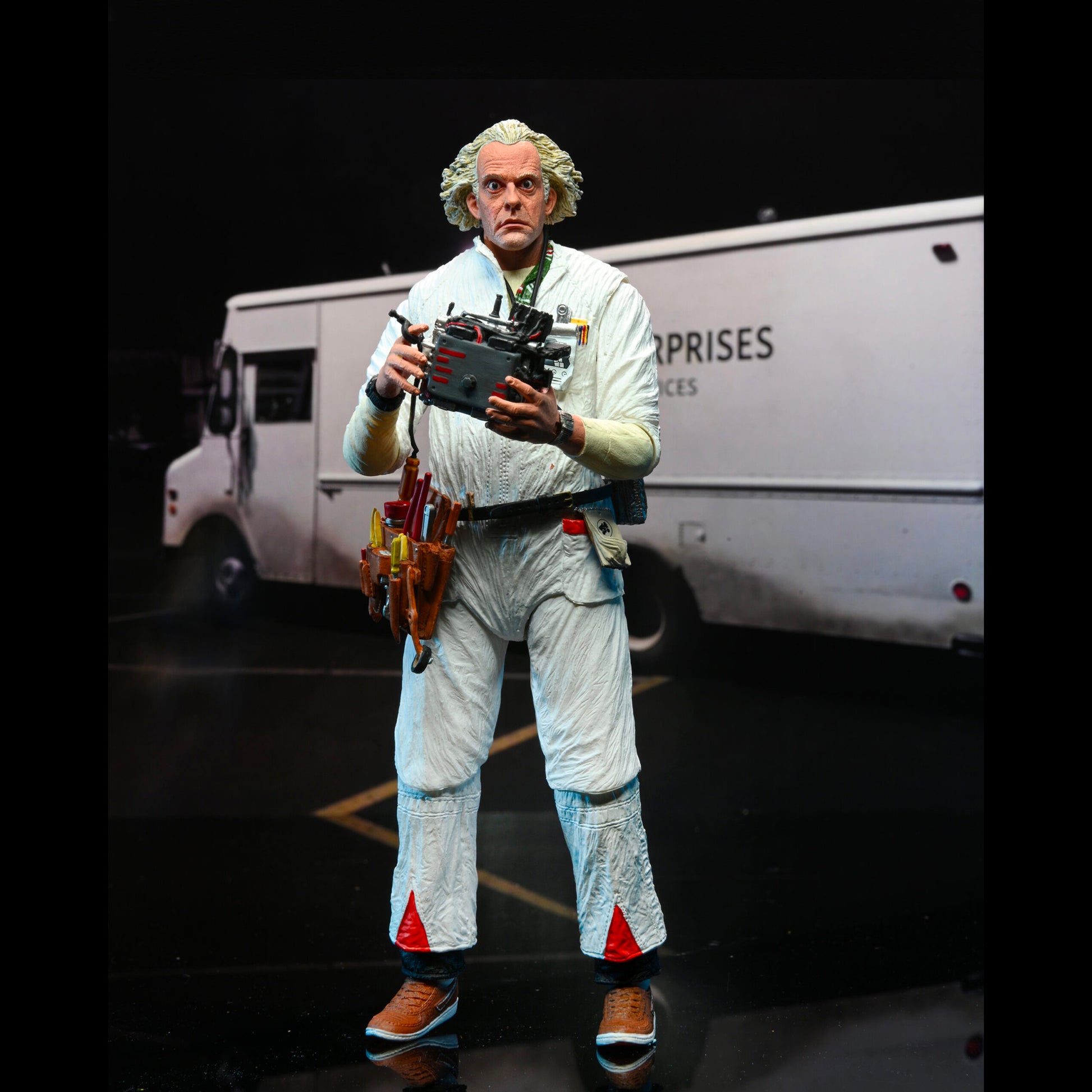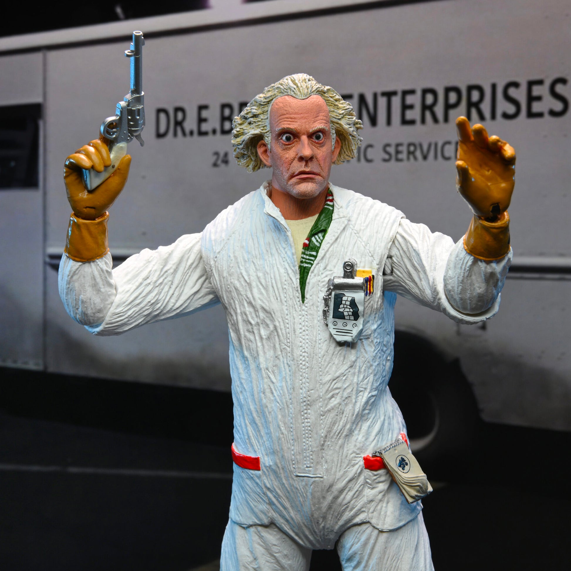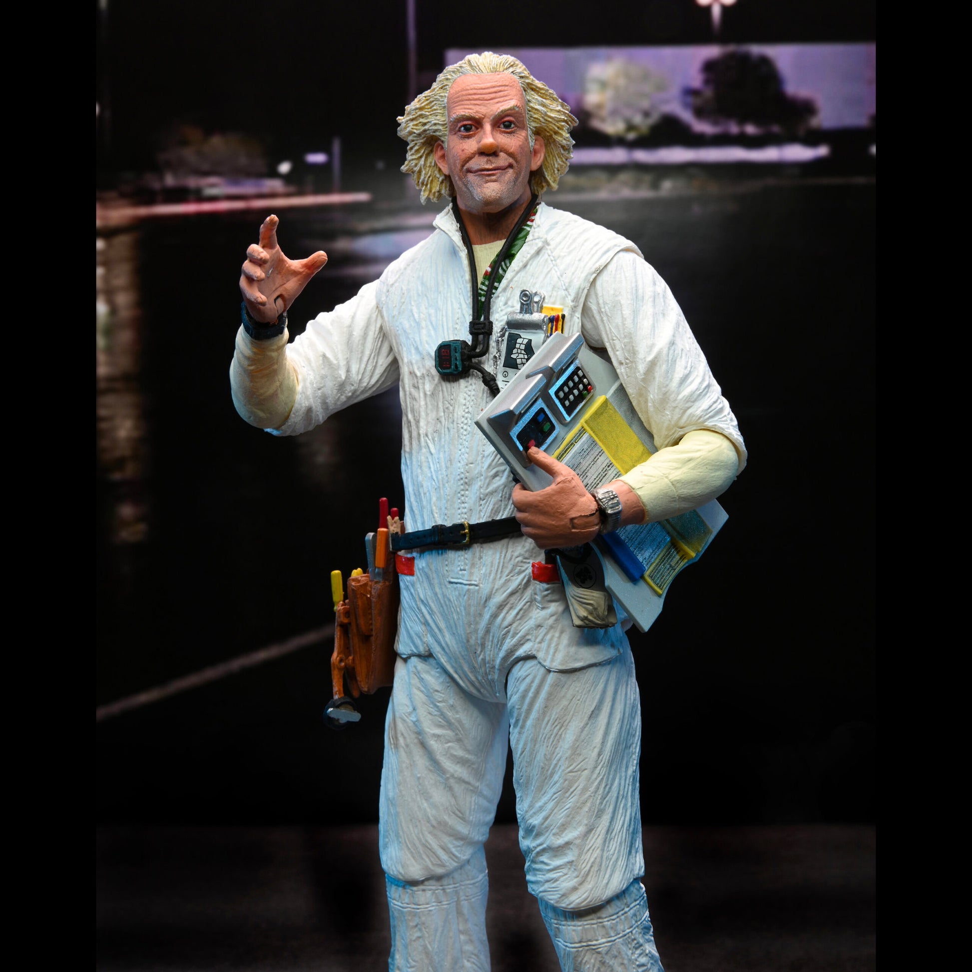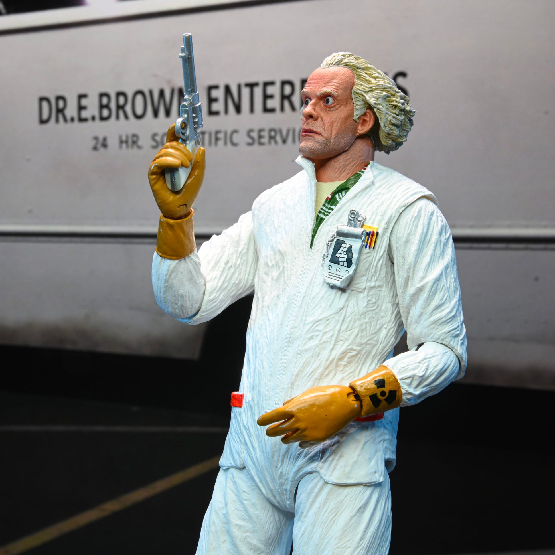 Featuring the officially licensed likeness of actor Christopher Lloyd, this Ultimate Doc Brown 7” scale action figure is based on his hazmat suit appearance in 1985. Includes interchangeable heads, swappable arms, hands, revolver, clipboard, and time machine remote control.