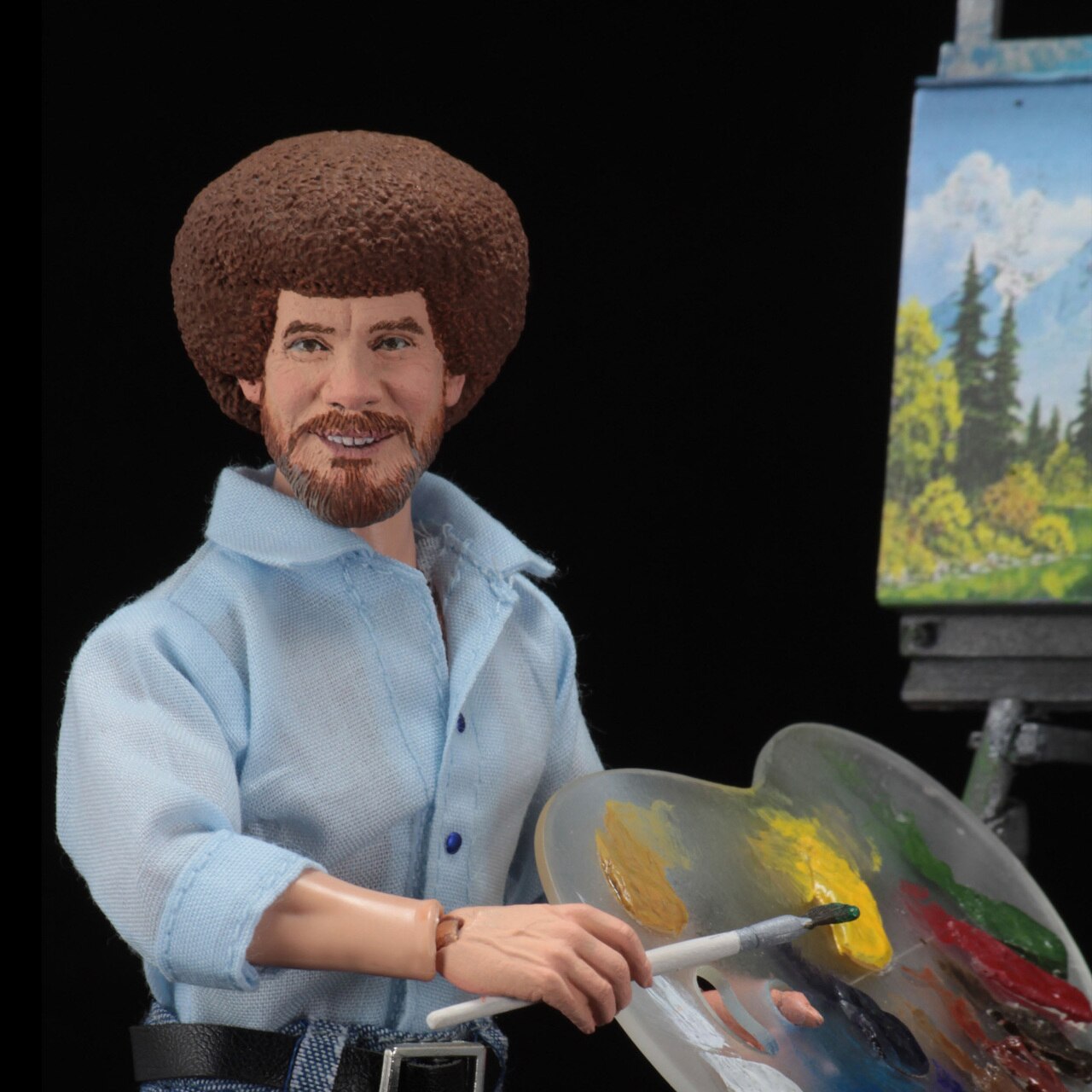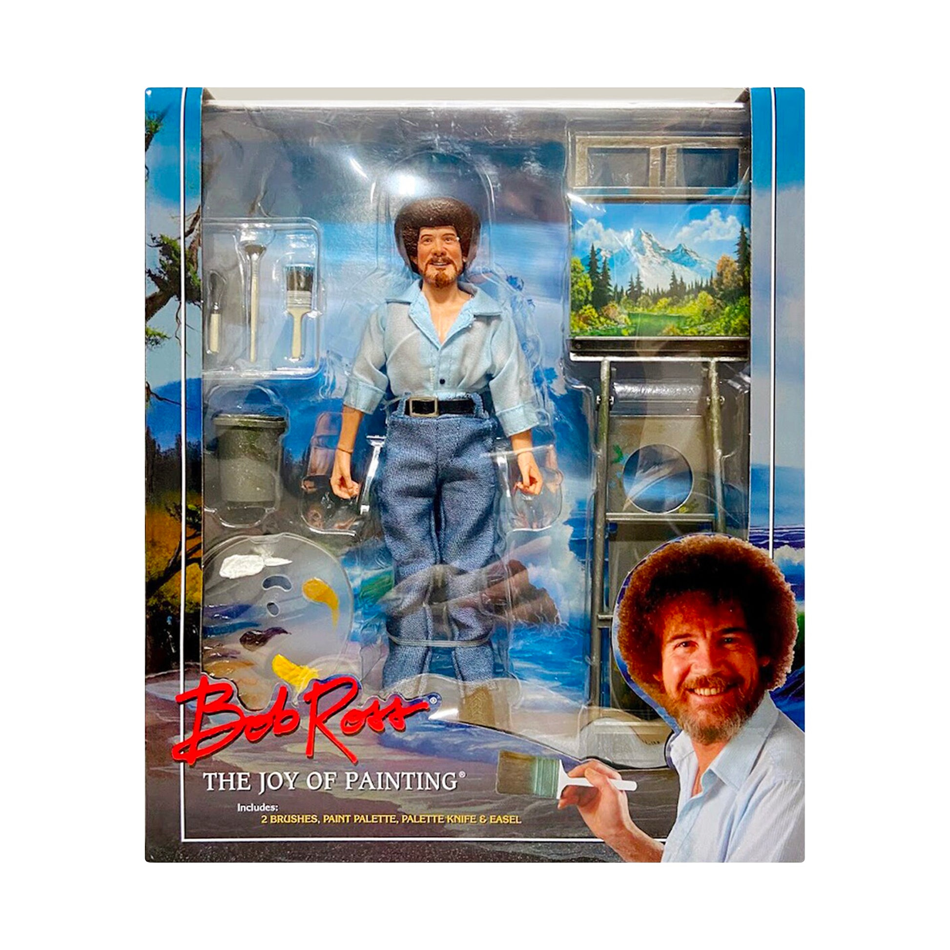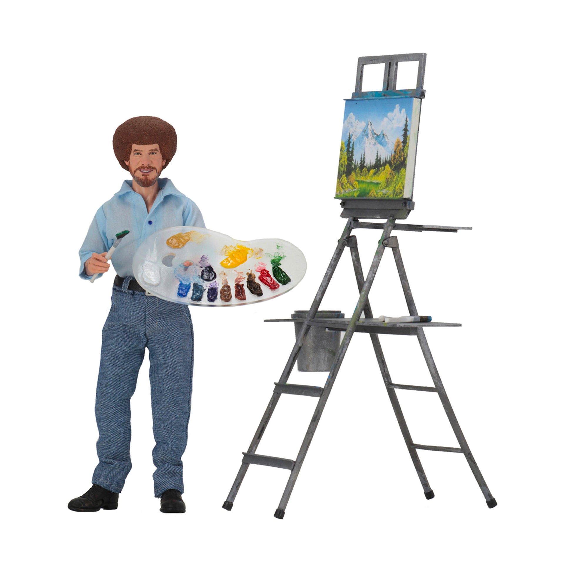 “All you need to paint is a few tools, a little instruction, and a vision in your mind.” Bob Ross, beloved host of the mega-popular television show The Joy of Painting, is the latest addition to NECA’s line of clothed action figures. Millions of people around the world are familiar with his soothing voice and amazing ability to bring beautiful scenes to life from blank canvas to completion in each half-hour episode. Standing at 8” tall and fully articulated, Bob Ross wears his signature look from The Joy of Painting and will create a happy little space on your shelf. He comes with a paint palette, 2 brushes, a palette knife, and a large easel display. Window box packaging.