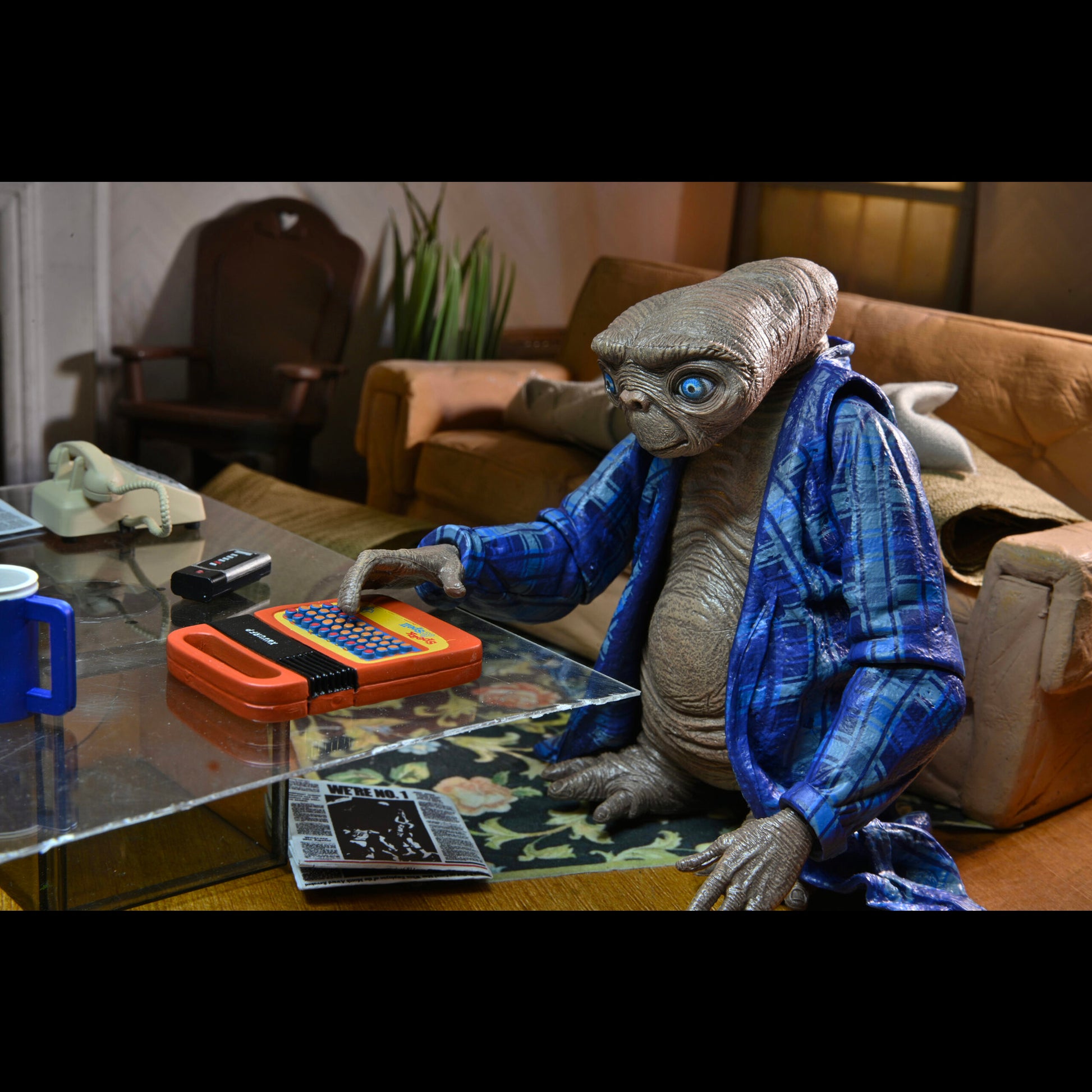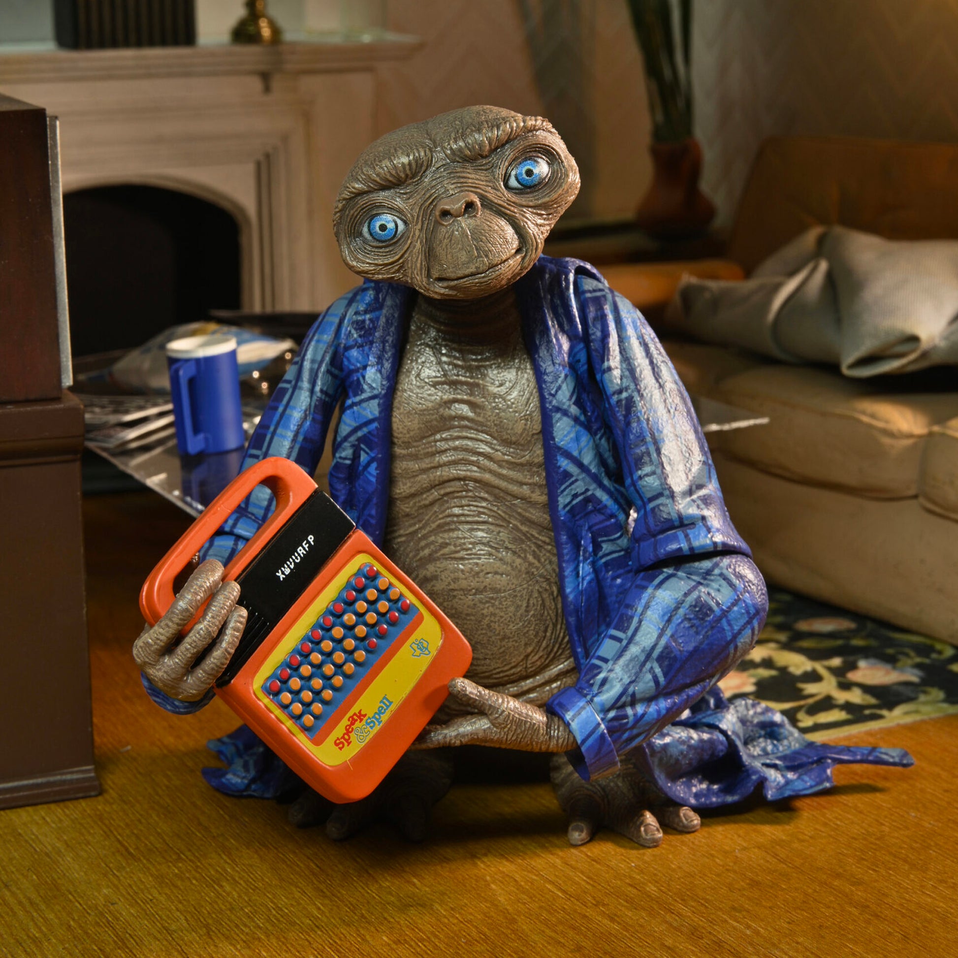 This Ultimate action figure celebrates the 40th anniversary of the beloved classic! Bring the magic and excitement of E.T. The Extra-Terrestrial into your world. As your friendship with E.T. grows, relive all of his earthly encounters or look to the stars and create your own unforgettable interactive adventures. Ultimate Telepathic E.T. features incredible life-like detail and wears the blue plaid bathrobe from the home scenes. E.T. stands in 7″ scale (meaning the figure is about 4.5″ tall) and is posable. Includes Speak & Spell, phone, and TV remote, plus interchangeable necks and hands. Comes in a display-friendly 40th-anniversary window box packaging with an opening front flap.