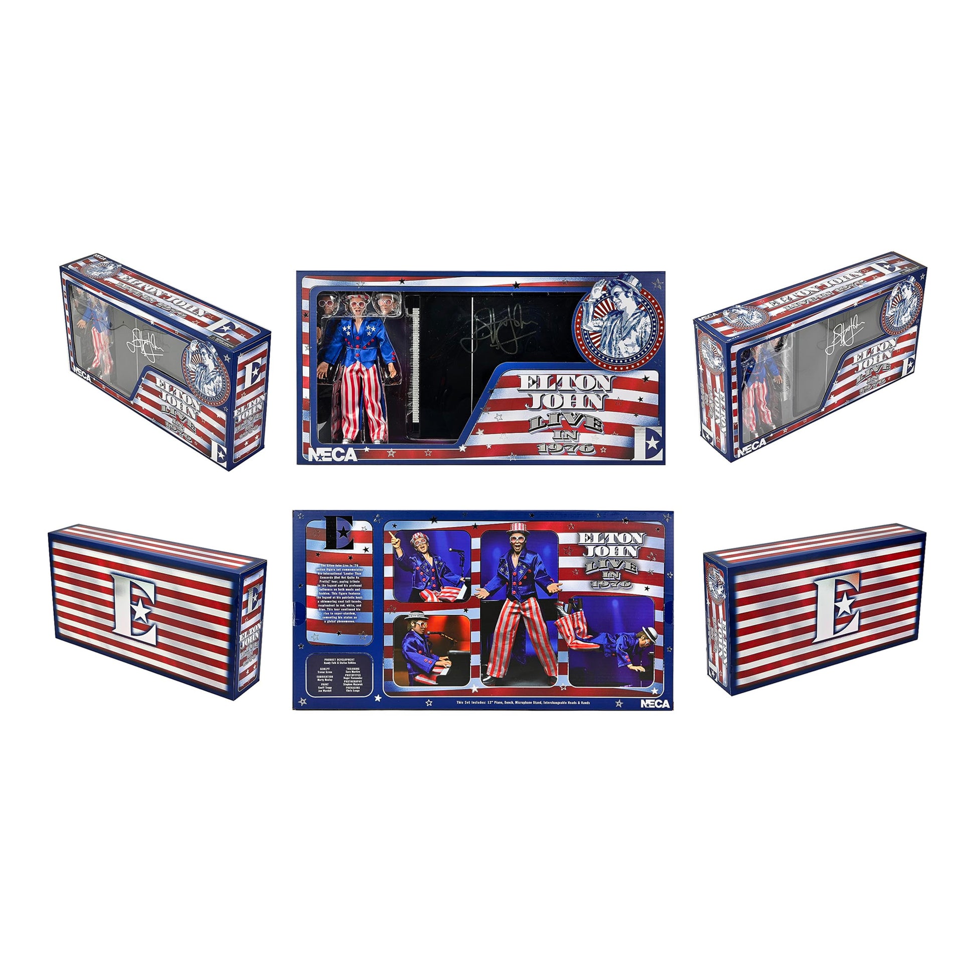In partnership with Elton John, NECA has produced a second deluxe tribute to the legend and his profound influence on both music and fashion. The Elton John Live in ‘76 action figure set stands 8 inches (20.3 cm) tall and features the legend in his patriotic best: a shimmering coat-tail tuxedo resplendent in red, white, and blue. The “Louder Than Concorde (But Not Quite As Pretty)” Tour cemented Elton’s status as a global phenomenon, and as appropriate we’ve included a massive 12-inch (30.5 cm) piano as it appeared during the tour! This deluxe set also includes a piano bench, microphone stand, interchangeable hands, and three interchangeable heads with different expressions.