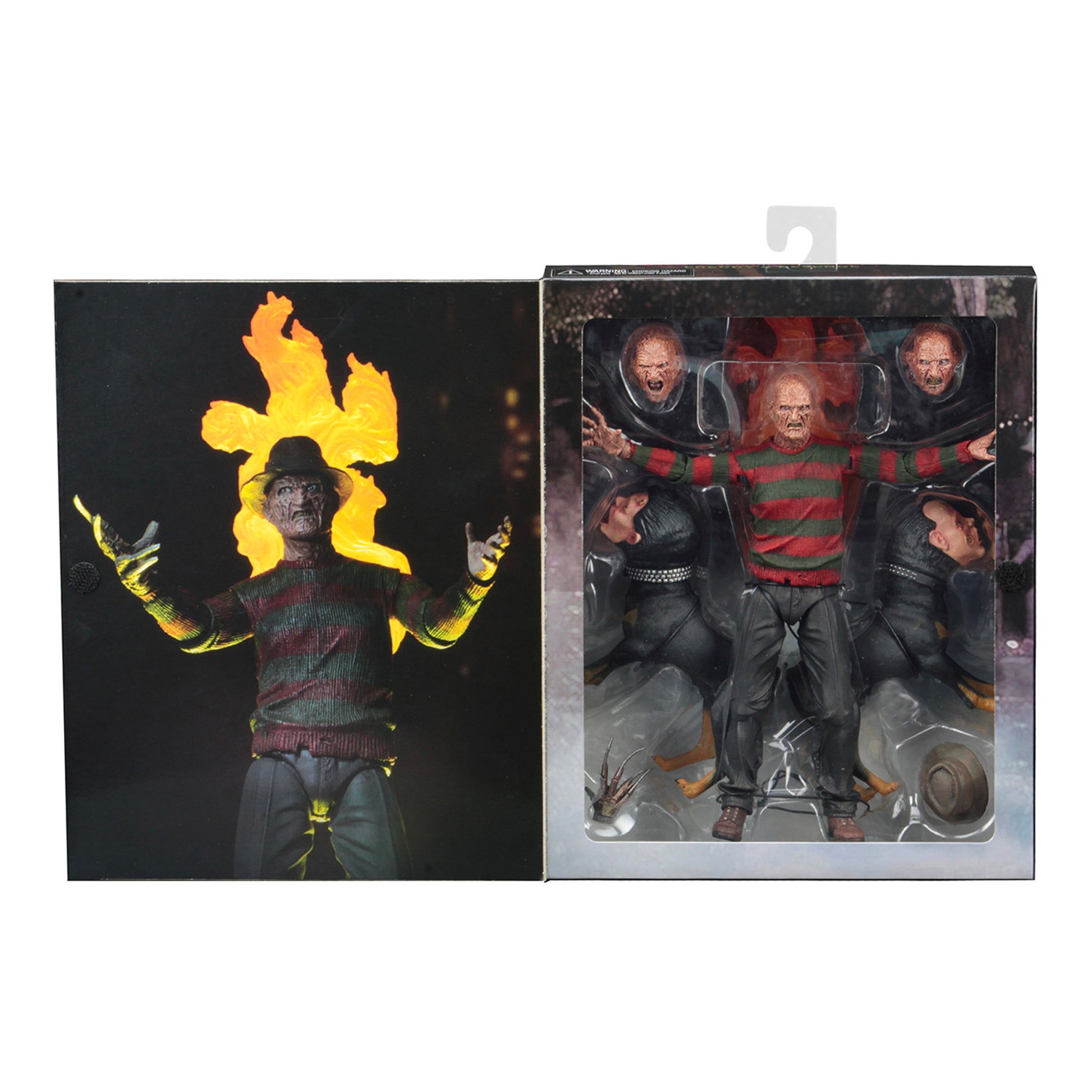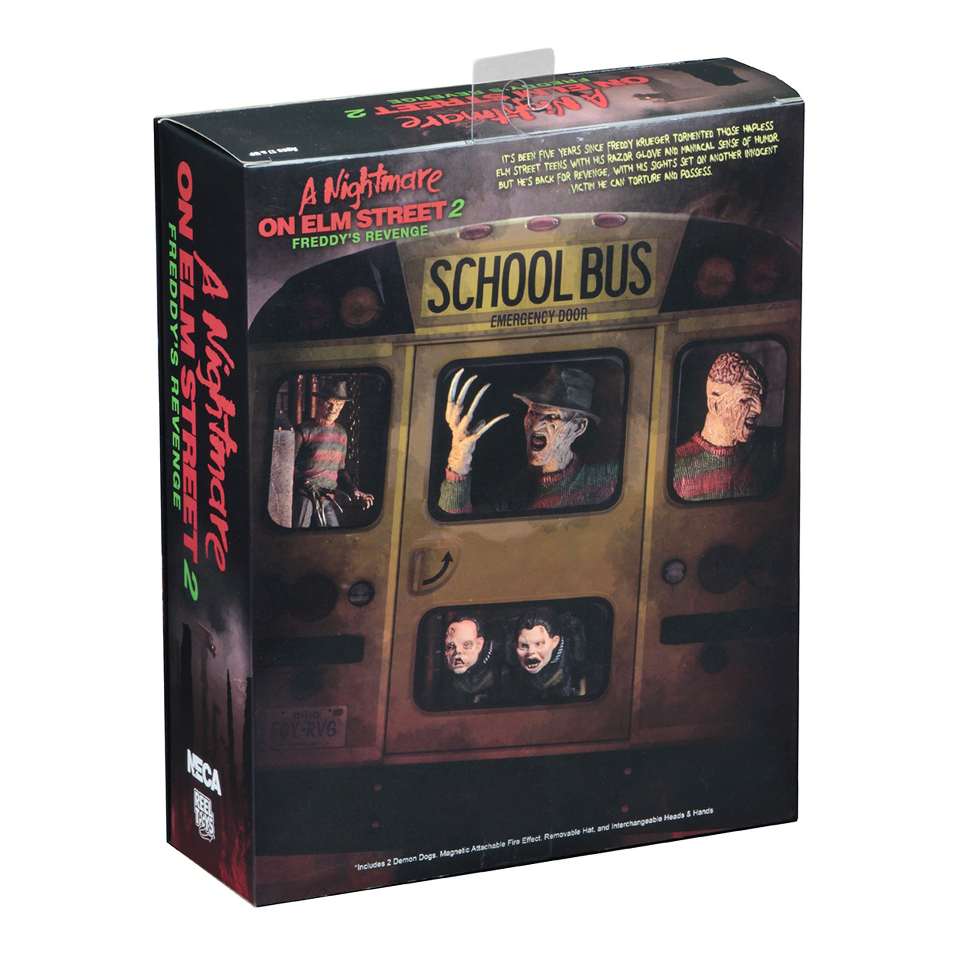 Ultimate Part 2 Freddy features plenty of gruesome detail and tons of accessories, including three interchangeable heads, 2 dogs, a gloved hand, a monster hand, and a removable hat. There’s even an attachable fire effect from the pool scene! The 7” scale figure is highly articulated and comes in a collector-friendly deluxe window box packaging with an opening flap.