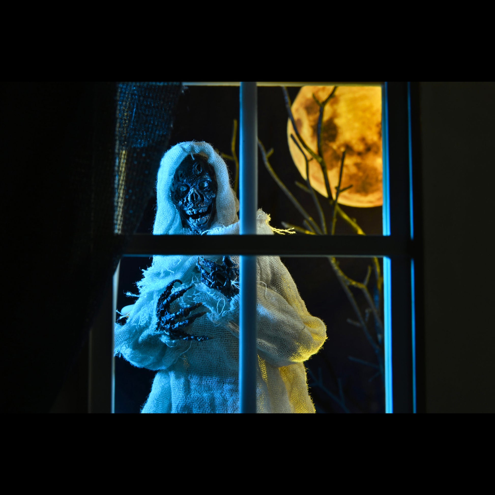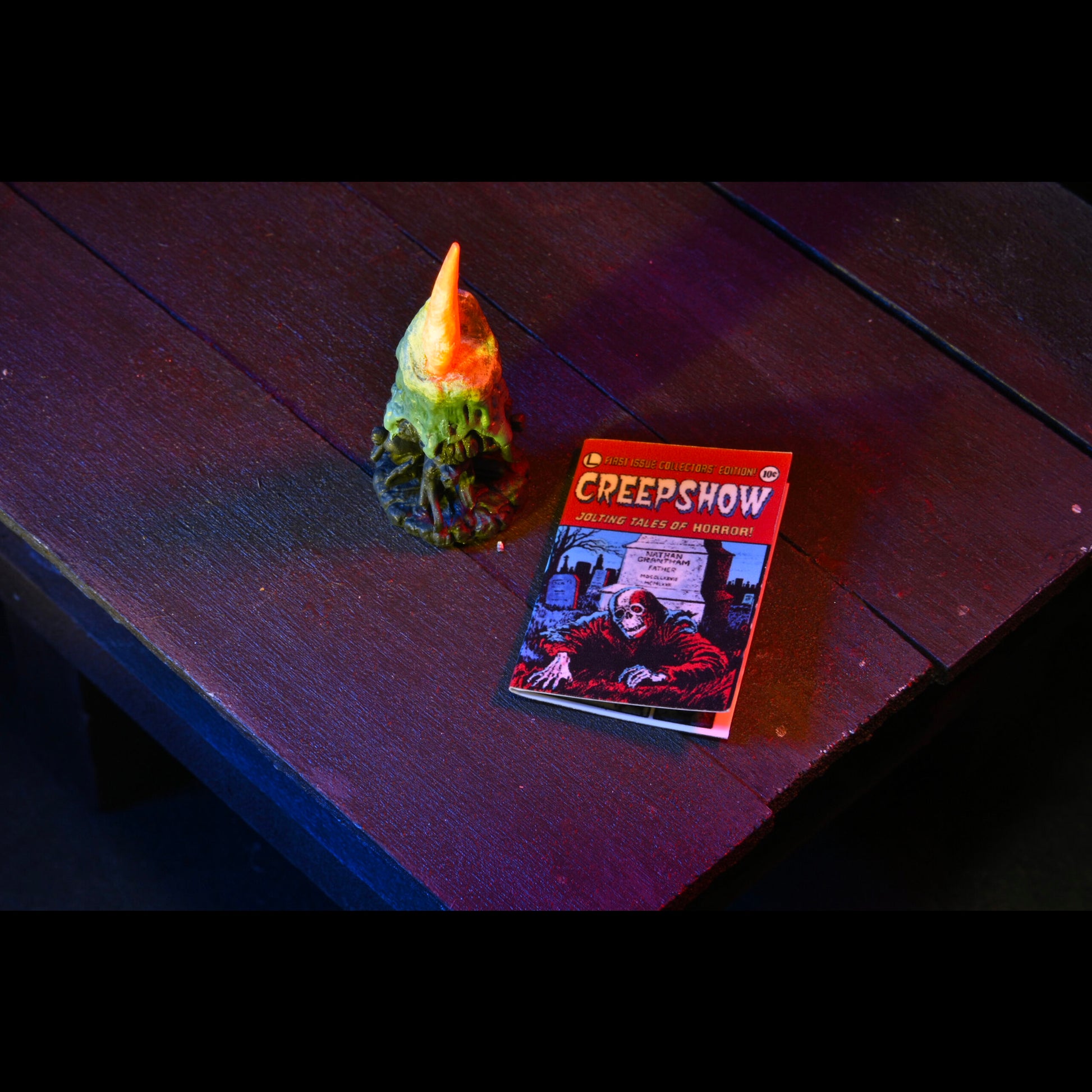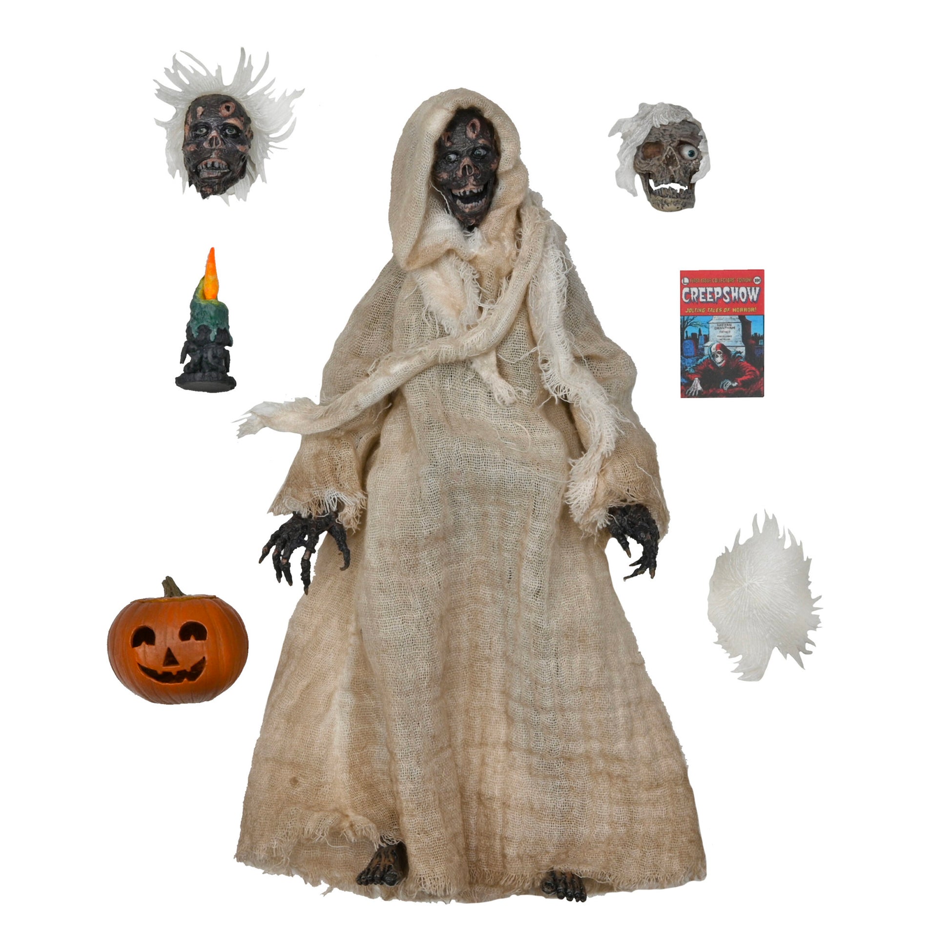 The Creep stands over 7 inches tall and is fully posable, with over 25 points of articulation. The figure features a fabric robe with wire armature so you can give it just the right positioning. The Creep also comes with interchangeable heads, pumpkin, candle and Creepshow comic book accessories.