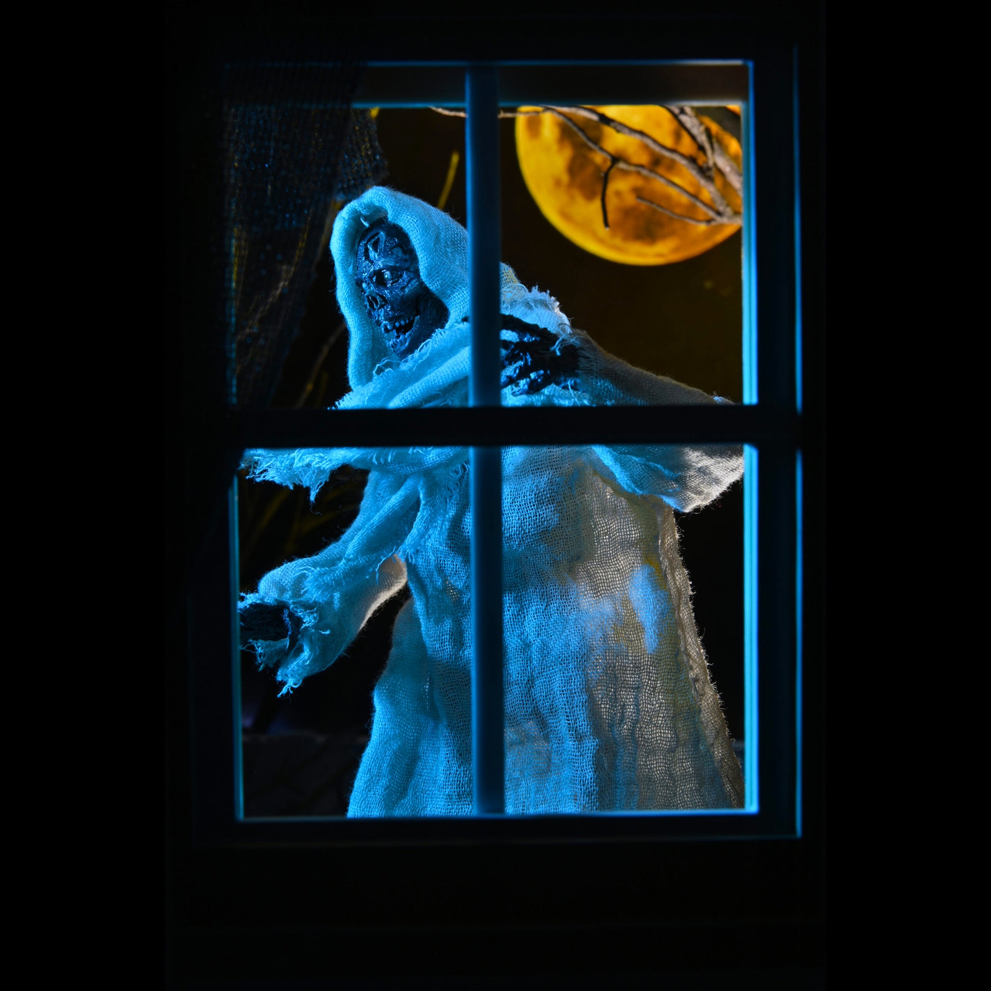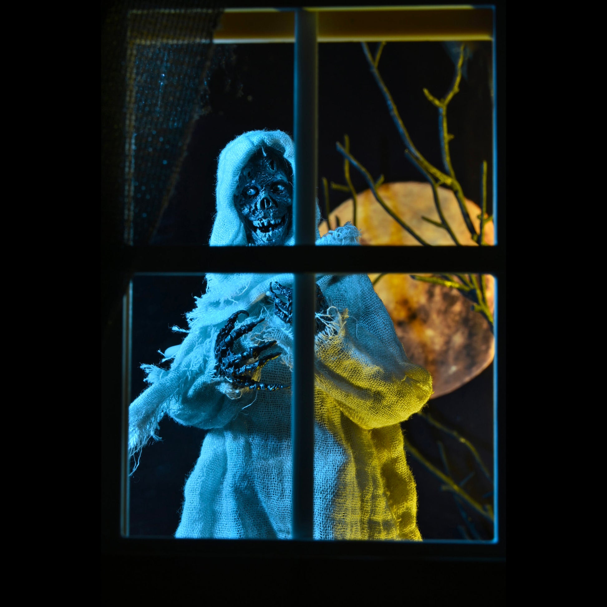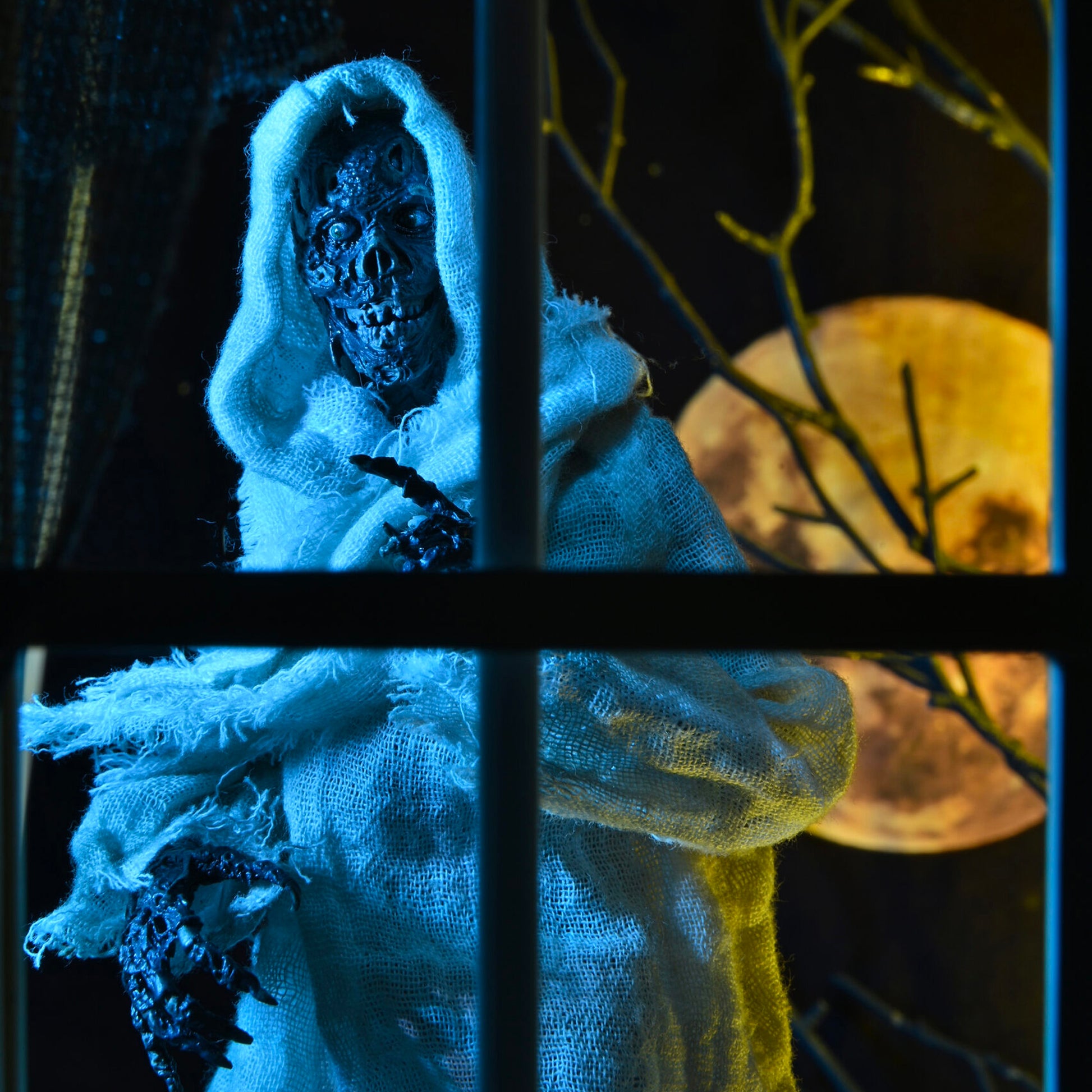 The Creep stands over 7 inches tall and is fully posable, with over 25 points of articulation. The figure features a fabric robe with wire armature so you can give it just the right positioning. The Creep also comes with interchangeable heads, pumpkin, candle and Creepshow comic book accessories.