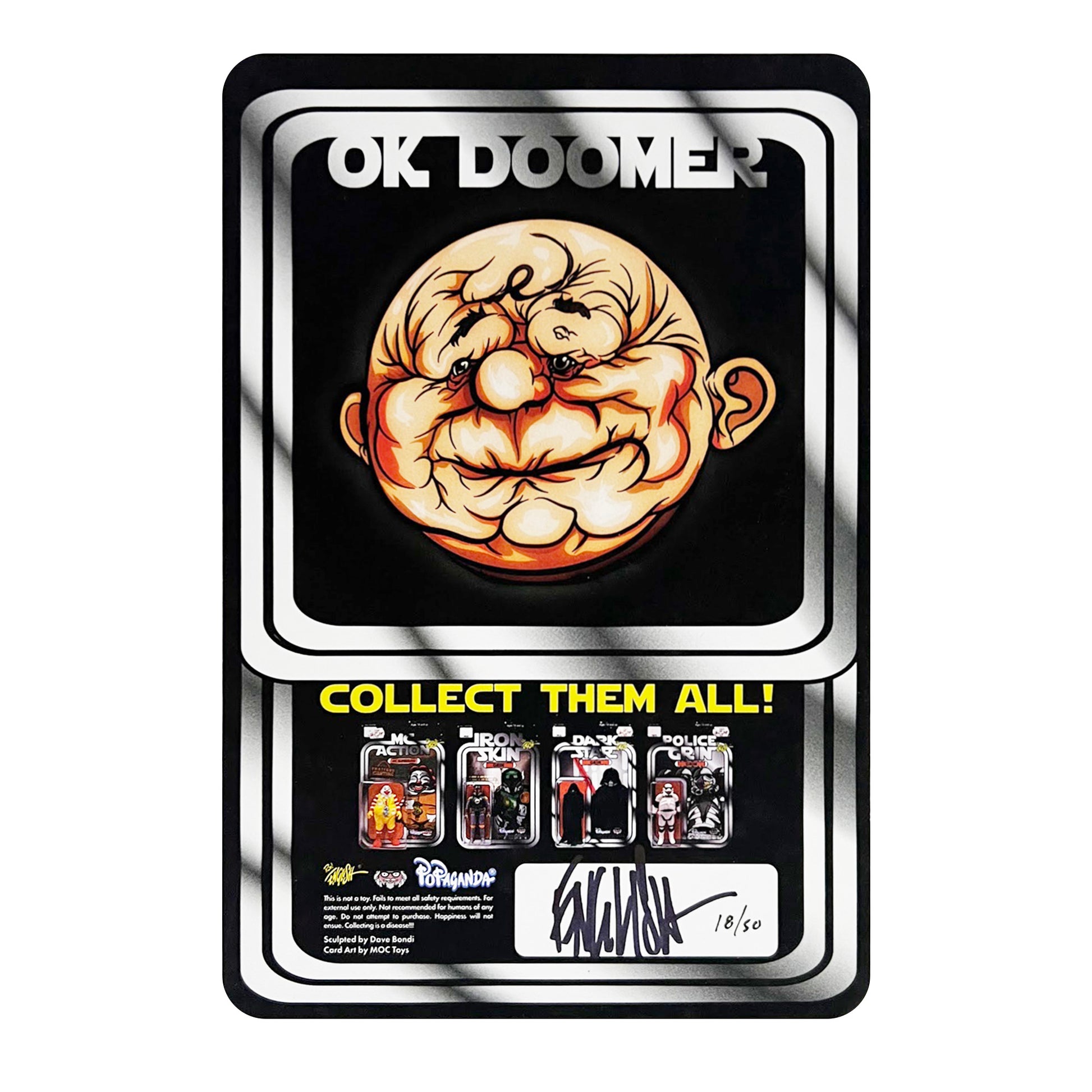 - Each one is signed by Ron English and on the back. Sculpted by Dave Bondi. Card back by Moc Toys.