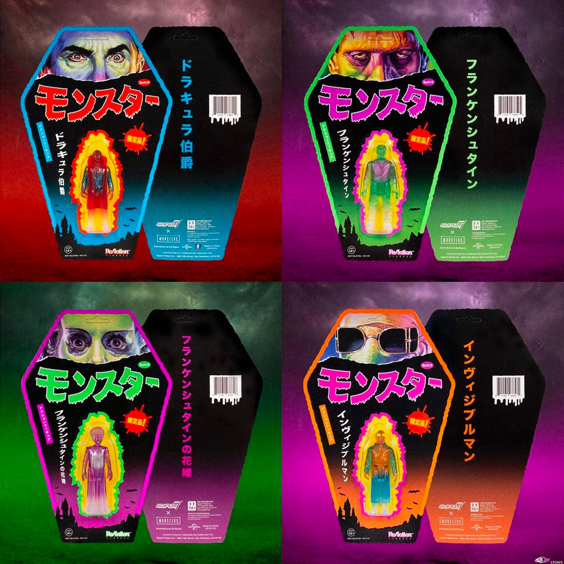 The Super7 x Universal Monsters collaboration continues with these exclusive translucent color 3.75" ReAction Figures on extra heavy Japanese-style cards!