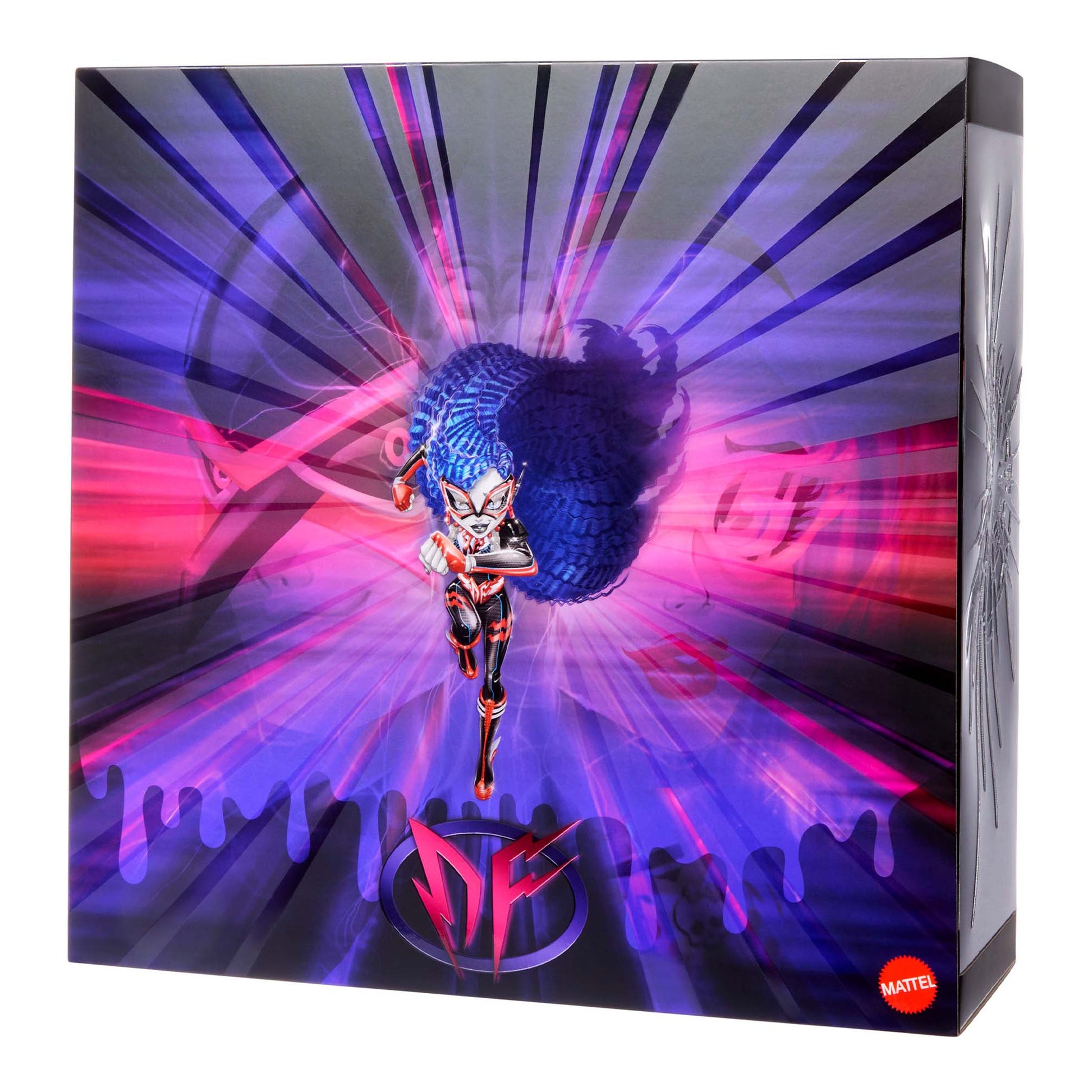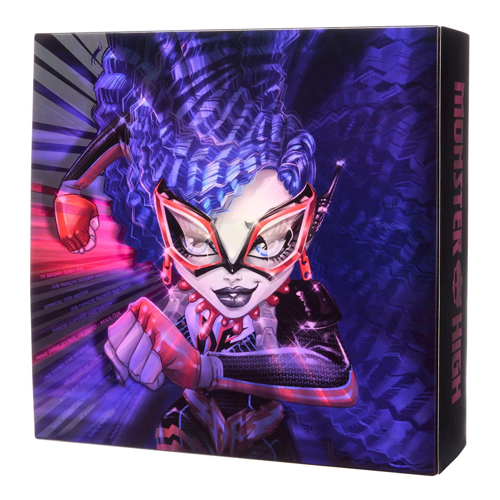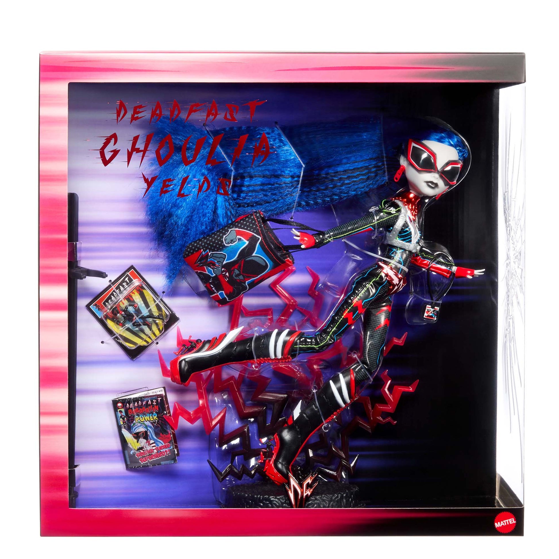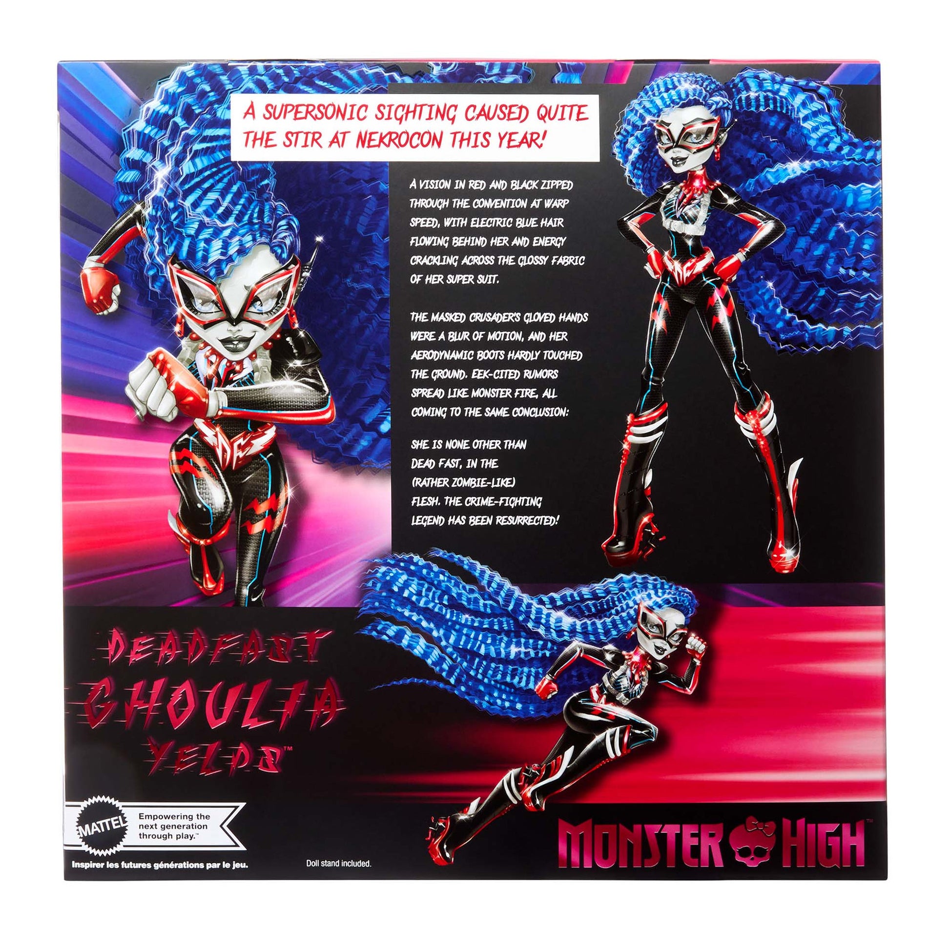 Don’t blink – you’ll miss celebrating the legendary Deadfast’s return. And Ghoulia Yelps, the smartest ghoul in school, is behind the mask. Normally a blur of motion, our creation catches this aerodynamic hero mid-stride. Sleek red energy crackles across the black, glossy fabric of her outfit, giving this iclawnic suit a high-tech, high-voltage upgrade. Her boots, made for supersonic speed, also feature a surprise Easter egg for fans of the heels.
