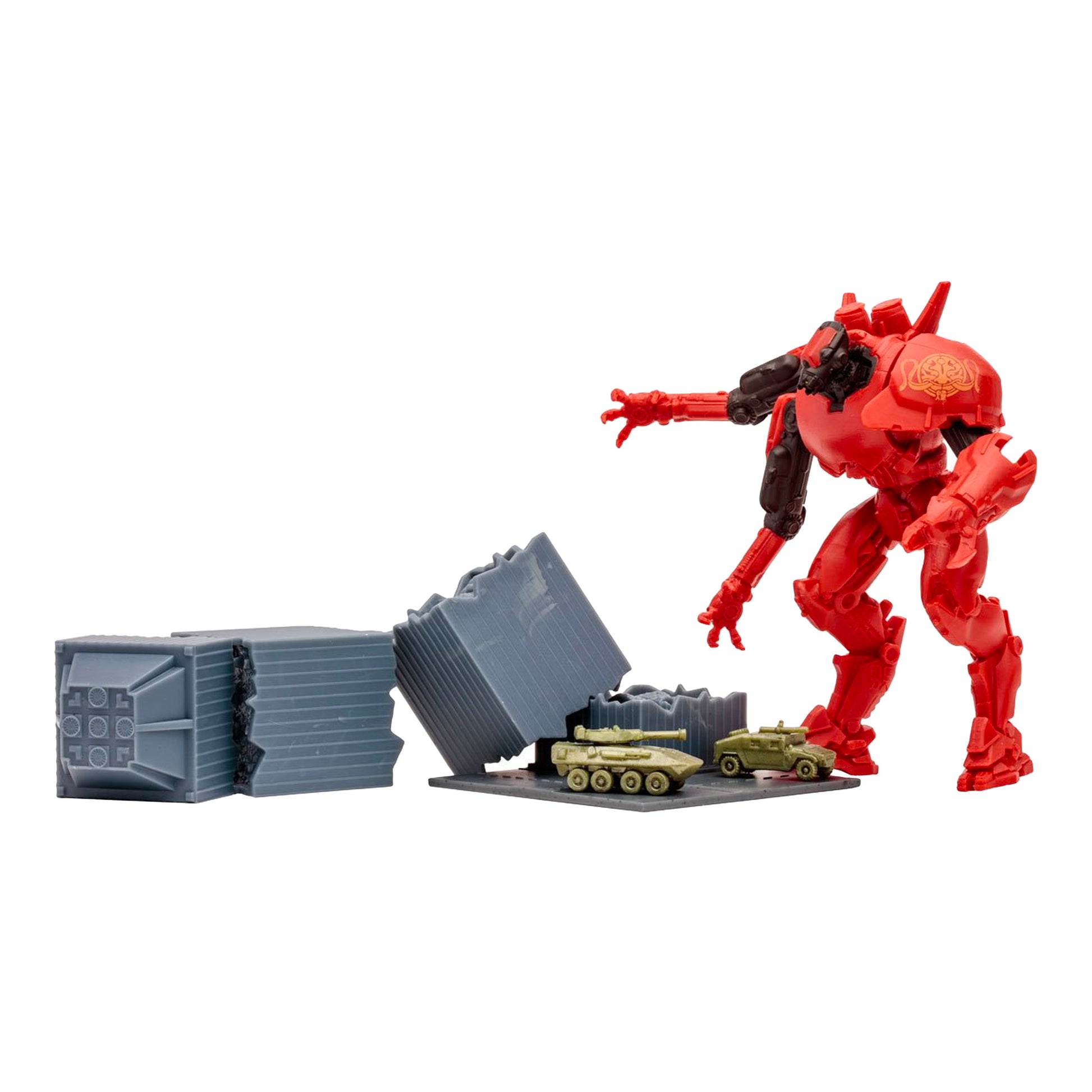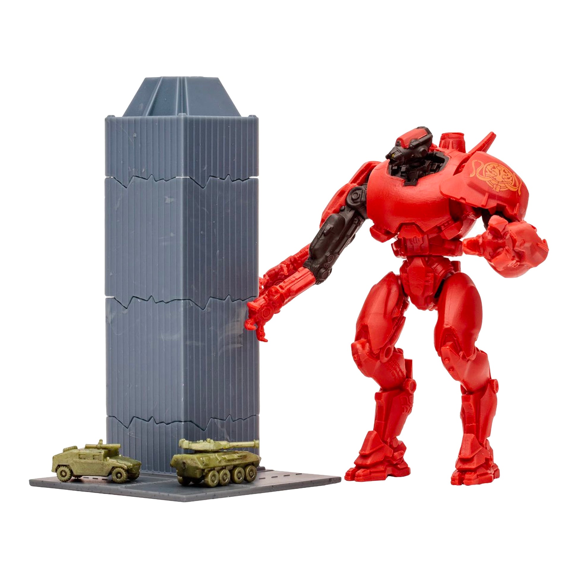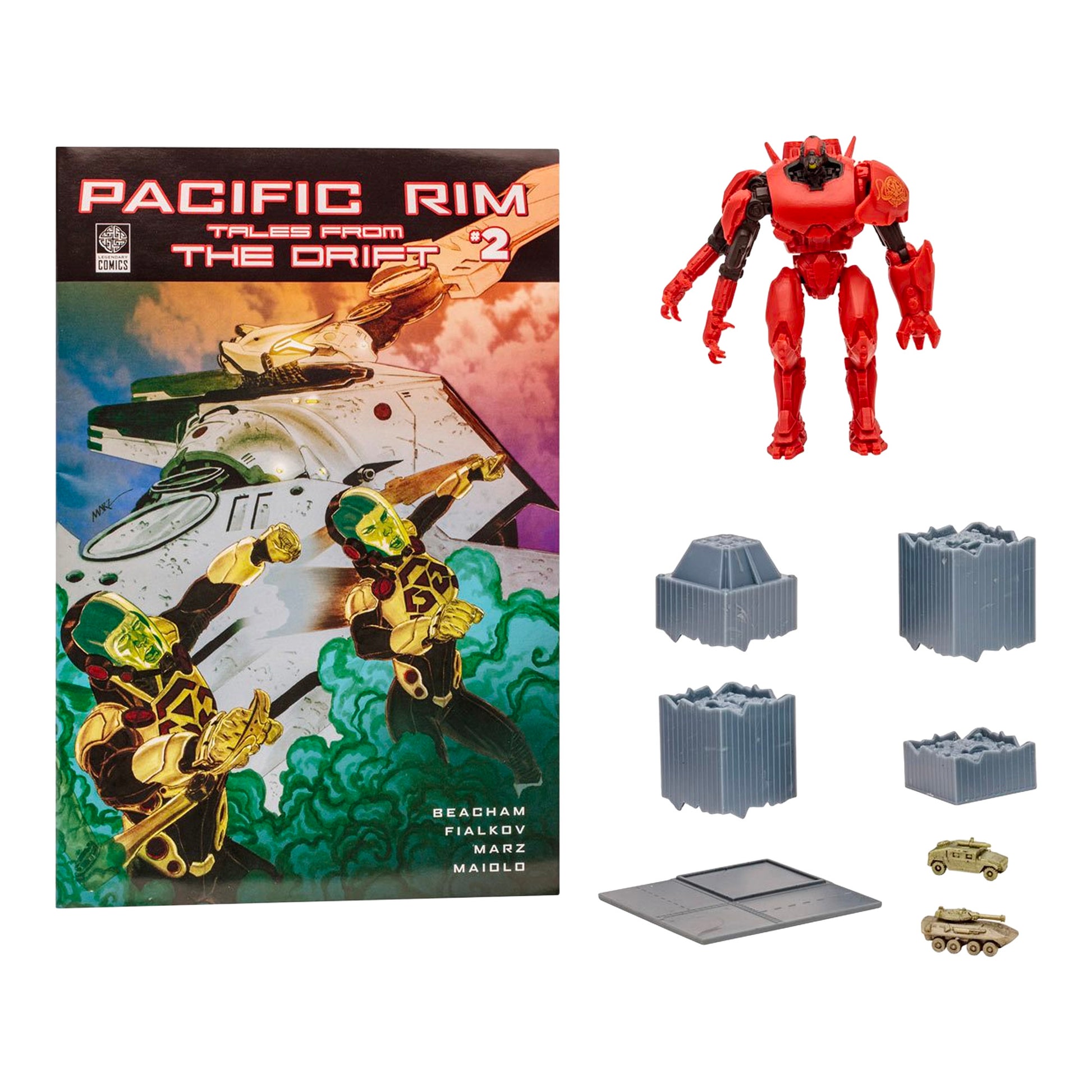 Crimson Typhoon stands about 4-inches tall with approximately 8 points of articulation. The Jaeger includes 4x rebuildable tower pieces, street section, and 2x miniature vehicles. Use the destructible building parts to create your own battle scenes! The Pacific Rim Jaeger Wave 1 Crimson Typhoon 4-Inch Scale Action Figure is packaged in a blister pack and comes with an English version Pacific Rim Tales From The Drift #2 comic book!