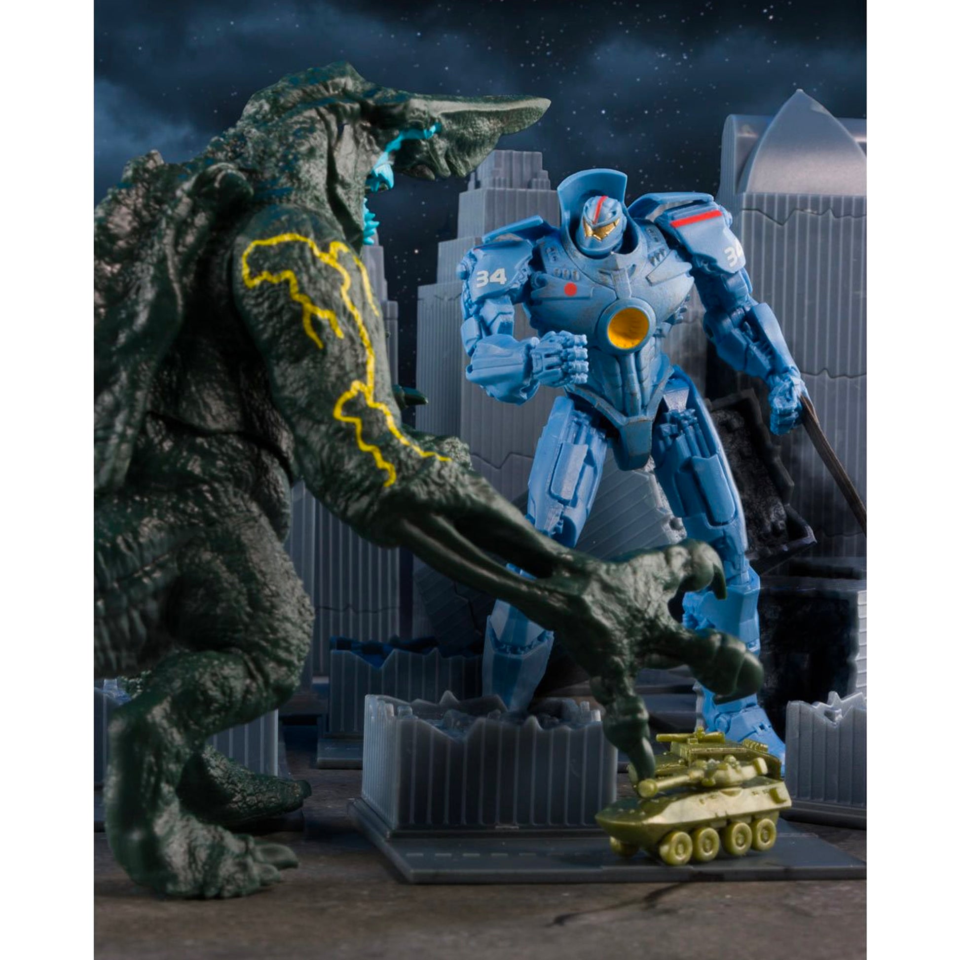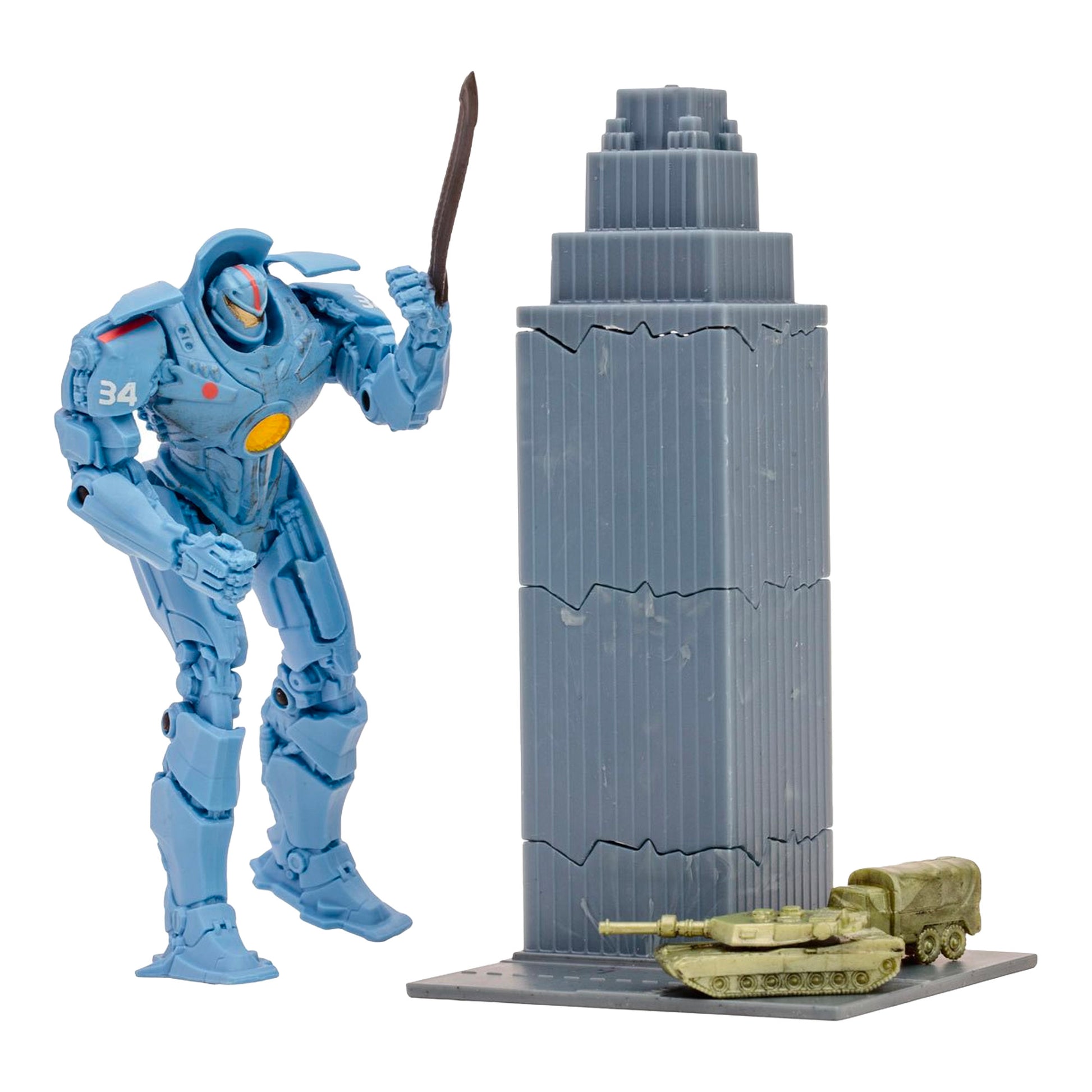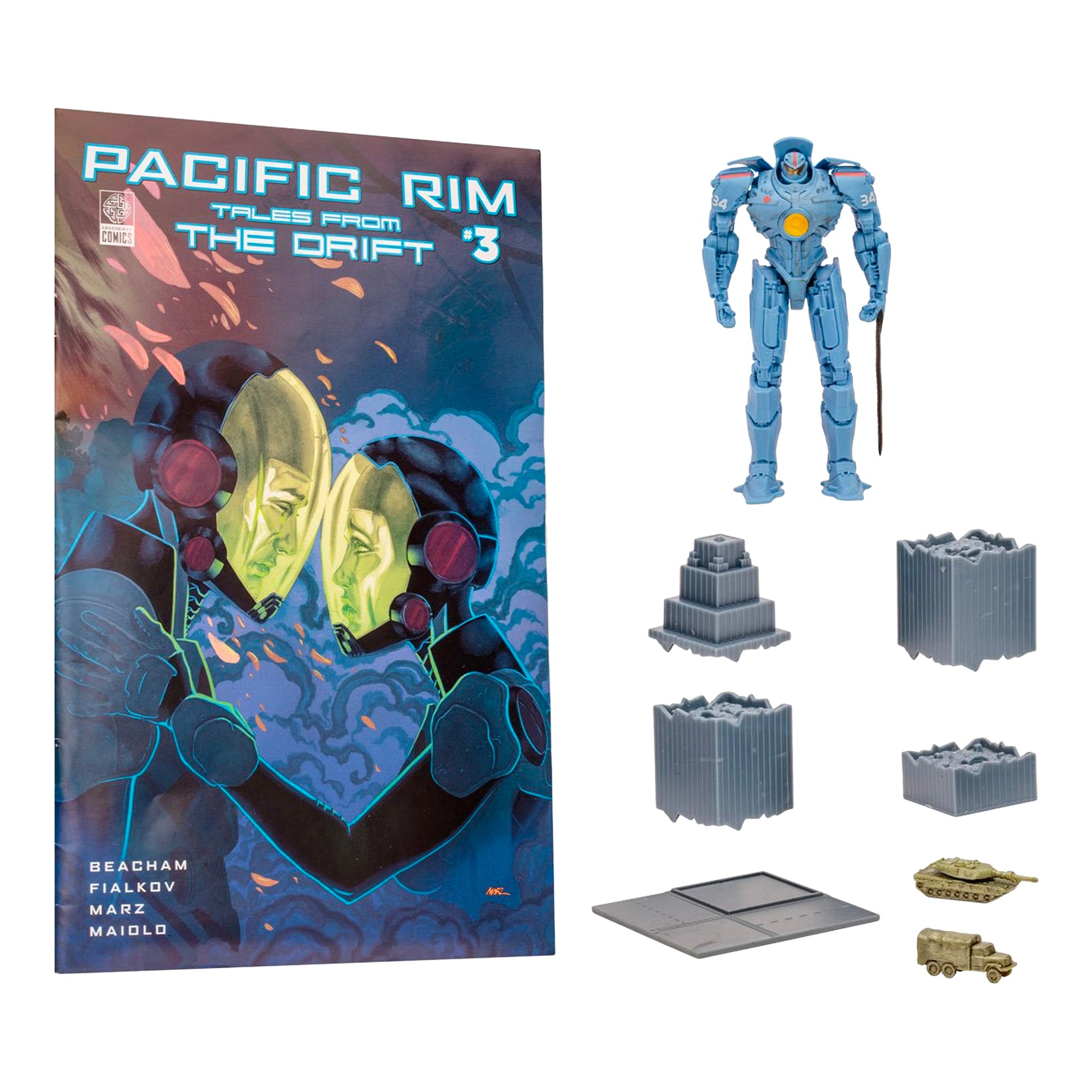 Gipsy Danger stands about 4 inches tall with approximately 8 points of articulation. The Jaeger includes 4x rebuildable tower pieces, a street section, and 2x miniature vehicles. Use the destructible building parts to create your own battle scenes! The Pacific Rim Jaeger Wave 1 Gipsy Danger 4-Inch Scale Action Figure is packaged in a blister pack and comes with an English version Pacific Rim Tales From The Drift #3 comic book!